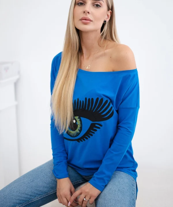 Bluzka z nadrukiem i dłuższym tyłem chabrowa