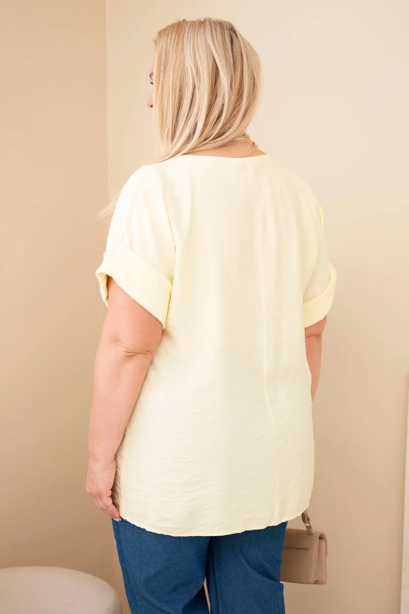 Bluzka damska wiskozowa Plus Size z krótkim rękawem i ozdobną apaszką w kolorze żółtym to stylowy i praktyczny wybór dla każdej kobiety poszukującej wygodnej, a zarazem efektownej garderoby. Jej lekka tkanina oraz przemyślany design z detalami takimi jak apaszka pozwalają poczuć się wyjątkowo i pewnie w każdej sytuacji. Nie czekaj – podkreśl swój styl już dziś i spraw sobie bluzkę, która zagości w Twojej szafie na długo!