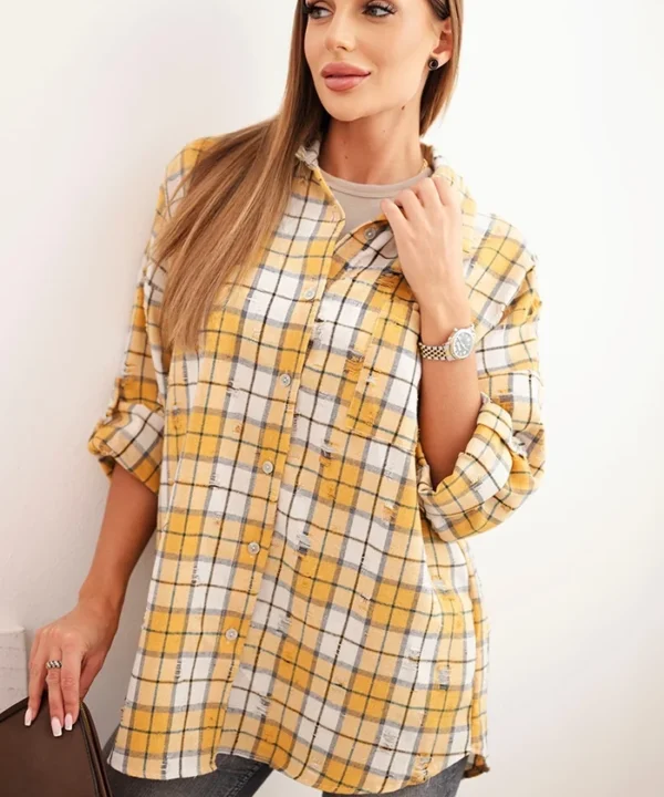 Koszula damska bawełniana w kratę z efektem przetarć musztardowa