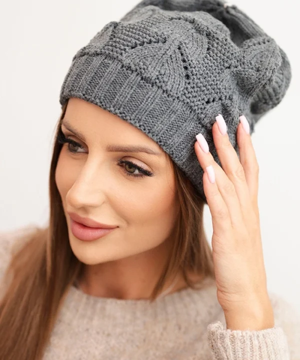 Czapka damska zimowa z wełną o strukturalnym splocie K432 grafitowa