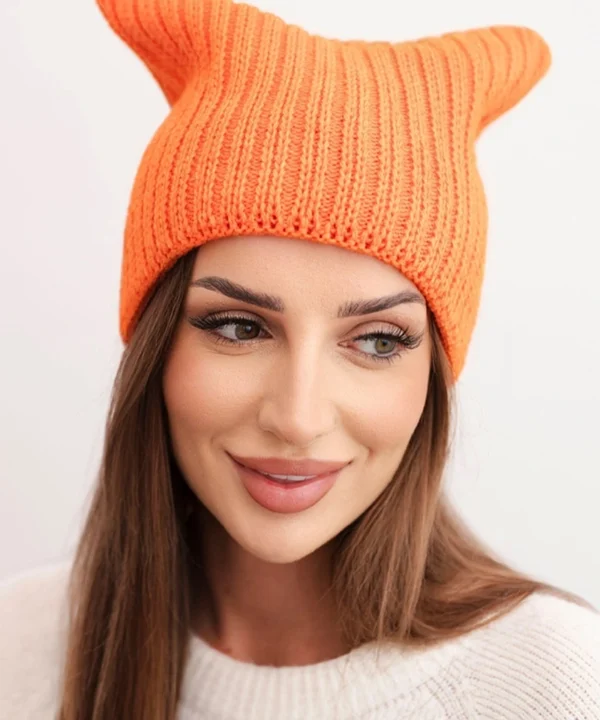 Czapka damska zimowa z wełną o kocim fasonie z prążkowanej dzianiny K419 pomarańczowa
