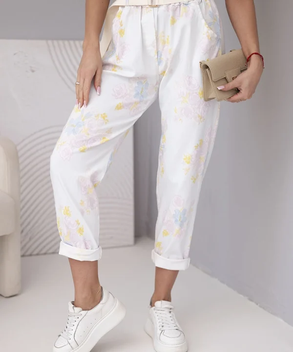 Spodnie damskie wiskozowe w kwiaty z paskiem białe