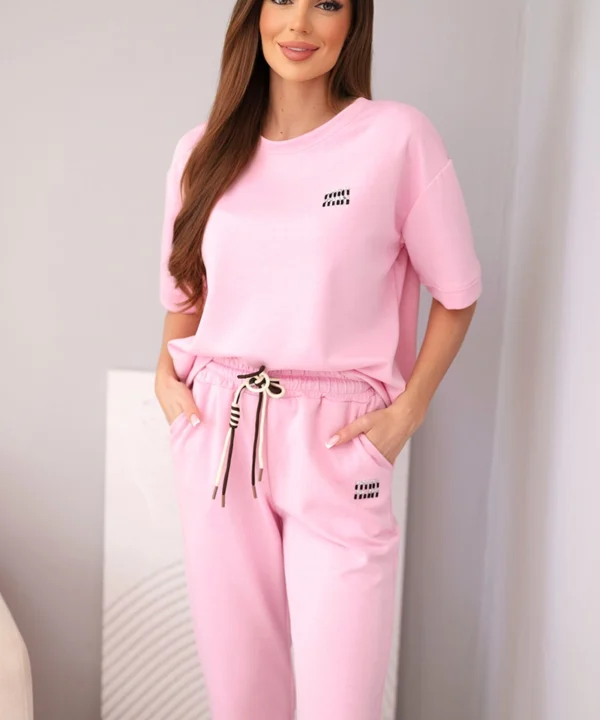 Komplet damski wiskozowy masełko z krótkim rękawem i spodniami z podwijaną nogawką jasny różowy