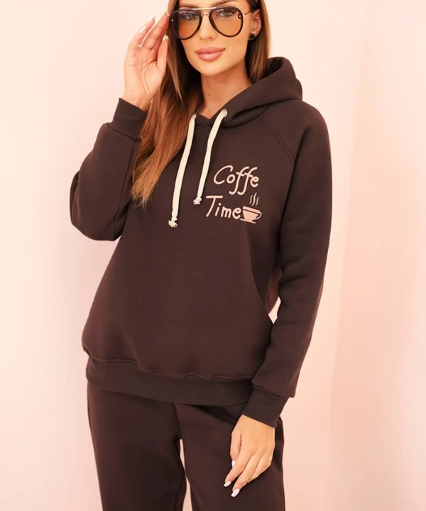Komplet damski bawełniany ocieplany z nadrukiem brązowy