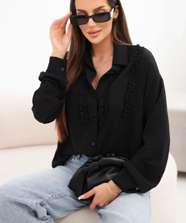 Koszula damska wiskozowa z długim rękawem i falbanami czarna