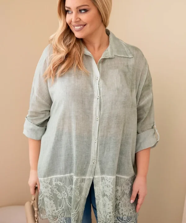 Koszula damska Plus Size bawełniana przecierana z koronkowym wykończeniem khaki