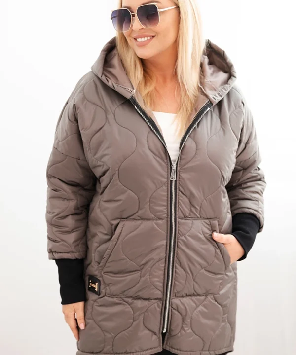 Ściągacz na dole kurtki to wyjątkowe rozwiązanie – umożliwia dopasowanie jej sylwetki do preferencji użytkowniczki, podkreślając atuty figury i dodając całości schludnego charakteru. Fason lekko oversize jest niezwykle modny i praktyczny, szczególnie dla pań noszących większe rozmiary, gwarantując jednocześnie komfort i swobodę ruchów.