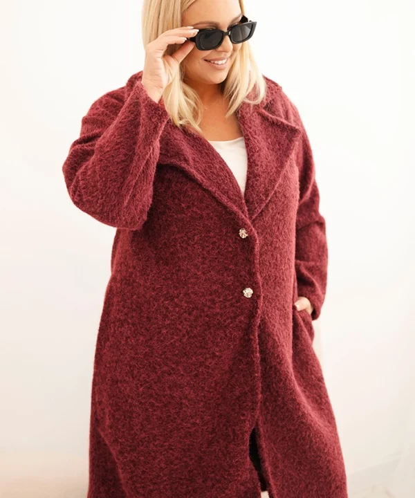 Płaszcz damski Plus Size z wełną i dużym kołnierzem bordowy