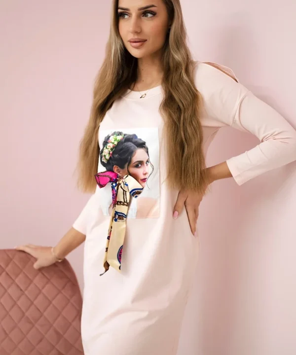 Sukienka z grafiką i kolorową kokardą 3D pudrowy róż