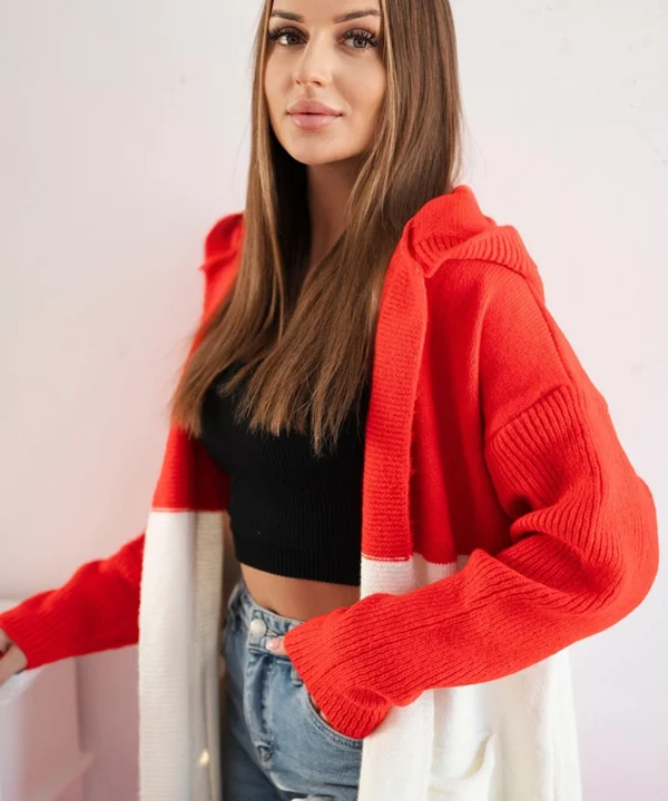 Sweter Kardigan z kapturem w pasy czerwony+ecru+różowy neon