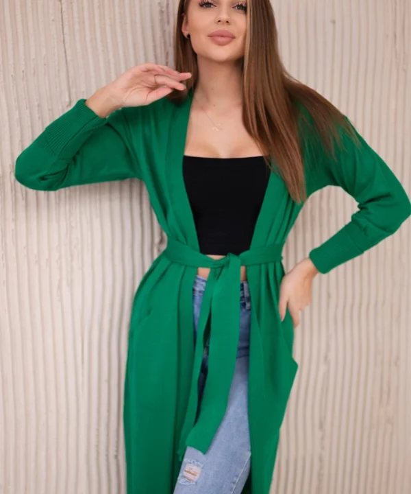 Sweter długi kardigan wiązany w talii zielony